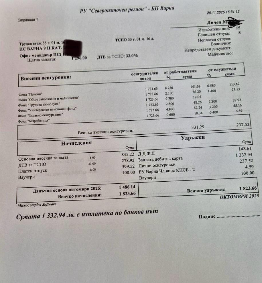 Клон: Варна. Нетна заплата в банковата сметка след удръжките (октомври 2025 г.) – 1332 лв.