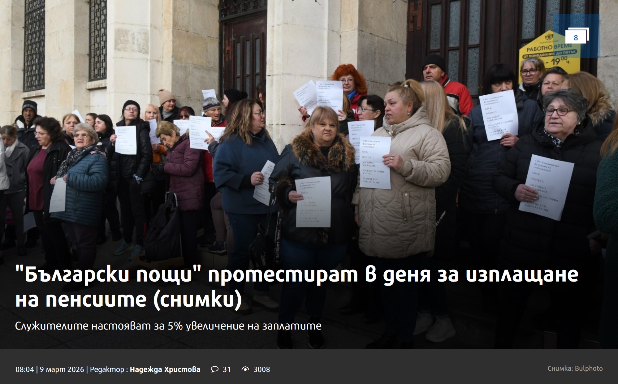 Работещите в „Български пощи“ излязоха на протест и спряха работа в началото на днешния ден, в който според графика за този месец следва да се раздават пенсиите.