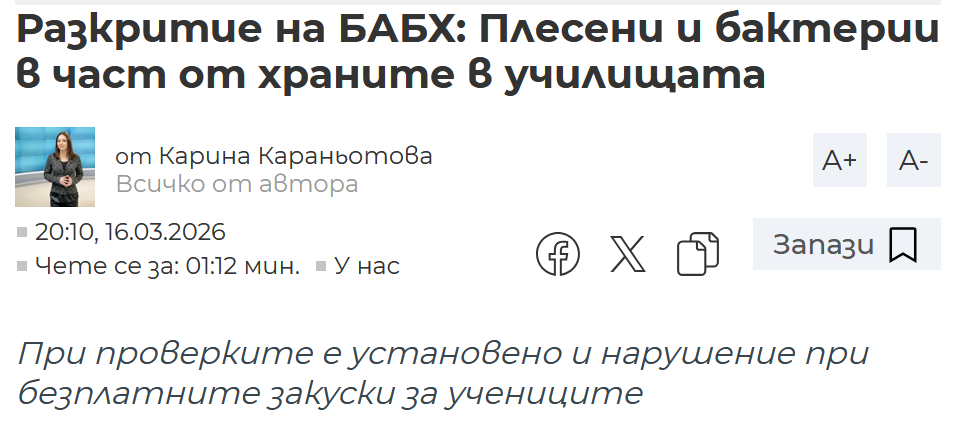 • Разкритие на БАБХ: Плесени и бактерии в част от храните в училищата