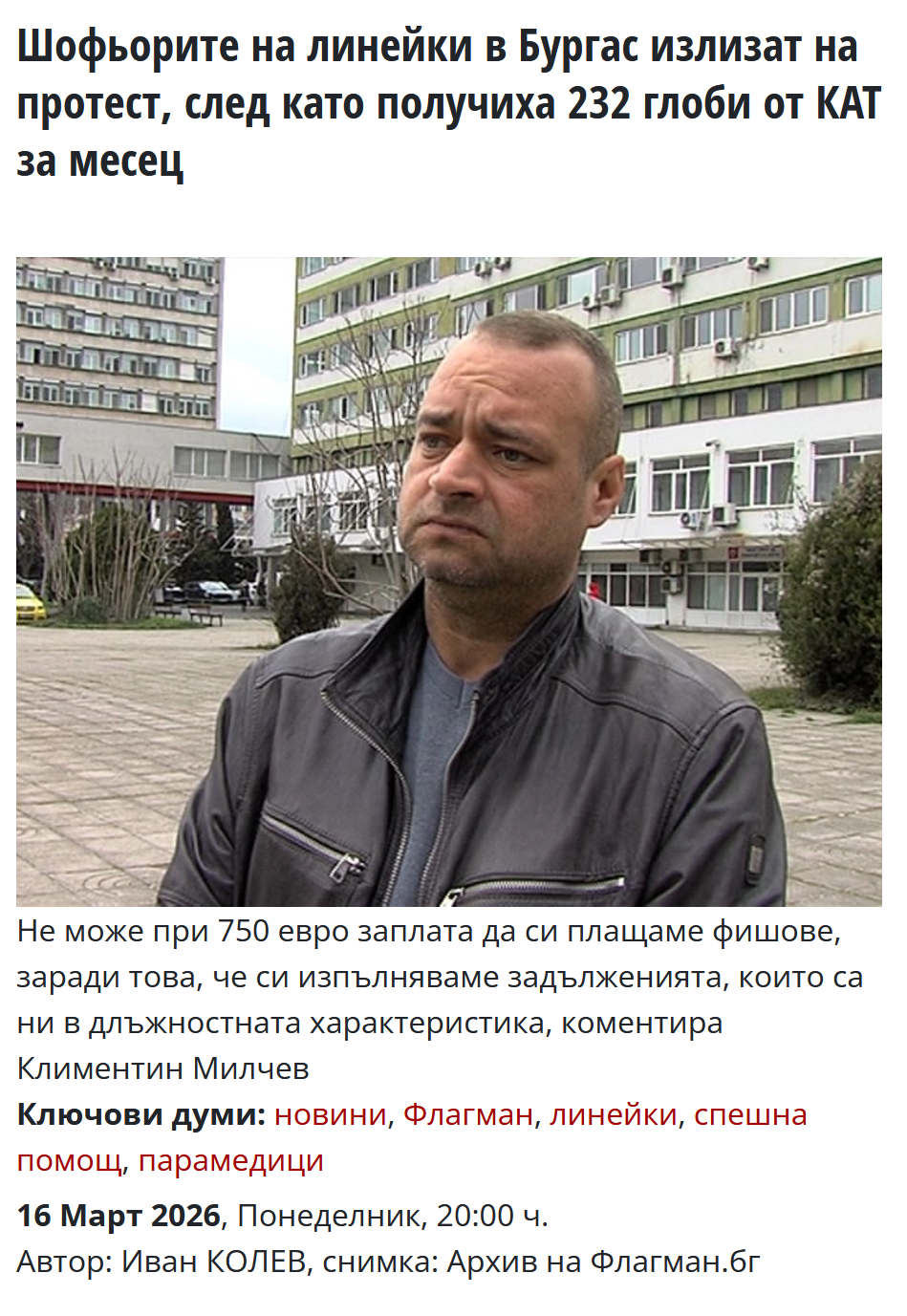„Имаме колега, който две седмици преди това да се случи, при изпълнение на служебни задължения, минава през светофара, плътно до друг автомобил. Човекът подава сигнал до шефа на КАТ, заради това, че бил стресиран от случилото се и колегата го наказаха с 3 месеца отнемане на книжката и глоба от 1000 лева. Все пак, ние изпълняваме нашите ангажименти, ние сме спешна помощ, не амбулатория“, каза Климентин Милчев.