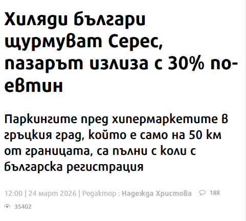 Хиляди българи пазаруват основни хранителни продукти и стоки за бита от магазините в гръцкия град Серес, който се намира само на около 50 километра от границата, съобщи кореспондентът на „24 часа“ в южната ни съседка Бойка Атанасова.