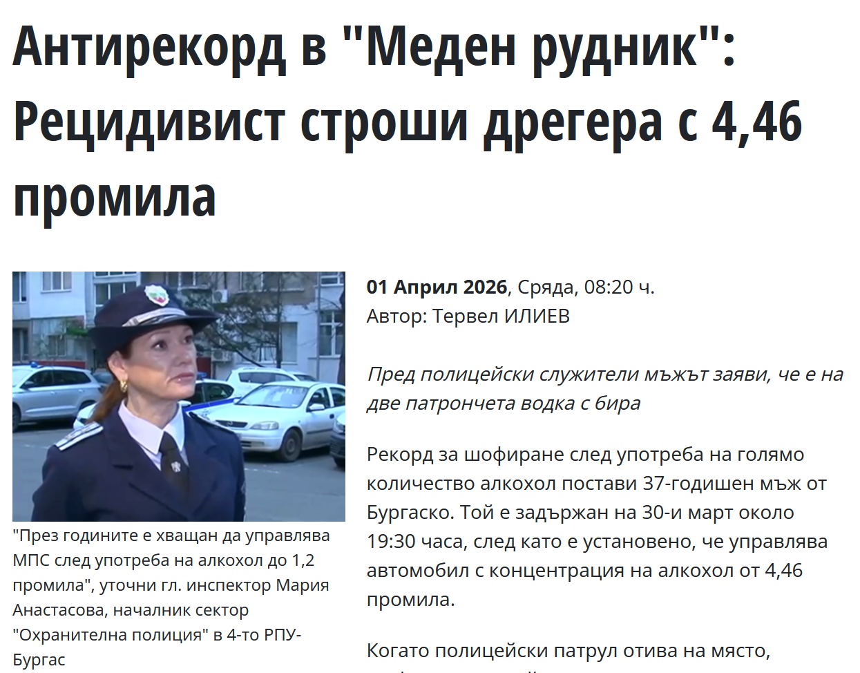 Рекорд за шофиране след употреба на голямо количество алкохол постави 37-годишен мъж от Бургаско. Той е задържан на 30-и март около 19:30 часа, след като е установено, че управлява автомобил с концентрация на алкохол от 4,46 промила.