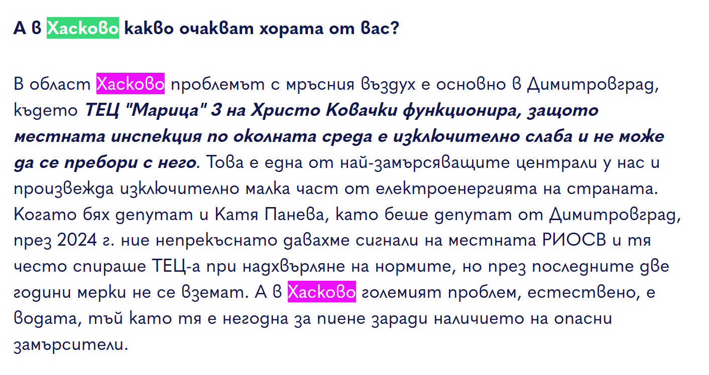 В област Хасково проблемът с мръсния въздух е основно в Димитровград, където ТЕЦ „Марица“ 3 на Христо Ковачки функционира, защото местната инспекция по околната среда е изключително слаба и не може да се пребори с него. B Хасково големият проблем, естествено, е водата, тъй като тя е негодна за пиене заради наличието на опасни замърсители.
